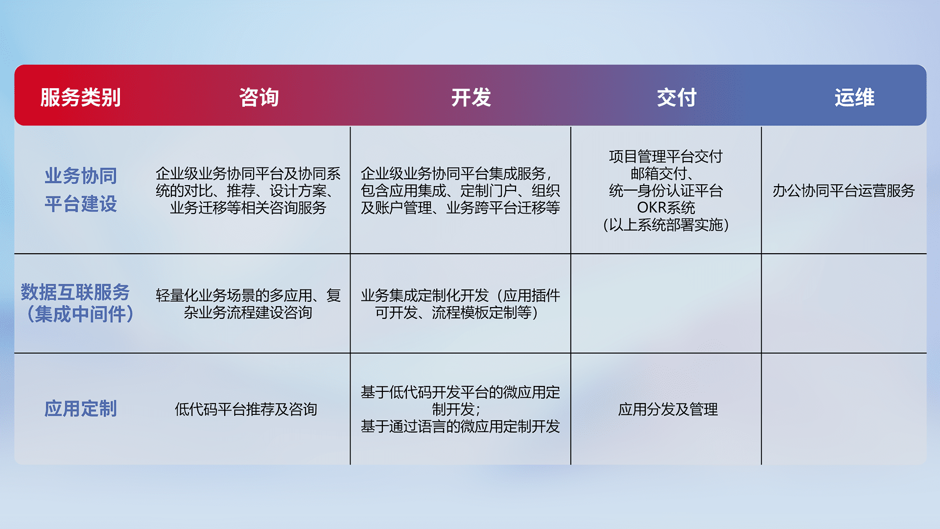 针对钉钉、、、、企微、、、IDaas等平台级产品提供产品的规划、、、方案、、、交付、、定制化开发等服务,,,,实现如统一协同办公、、、、智能客户服务、、混合会议管理、、智能数据查询、、等业务场景,,,,实现数字化转型。。