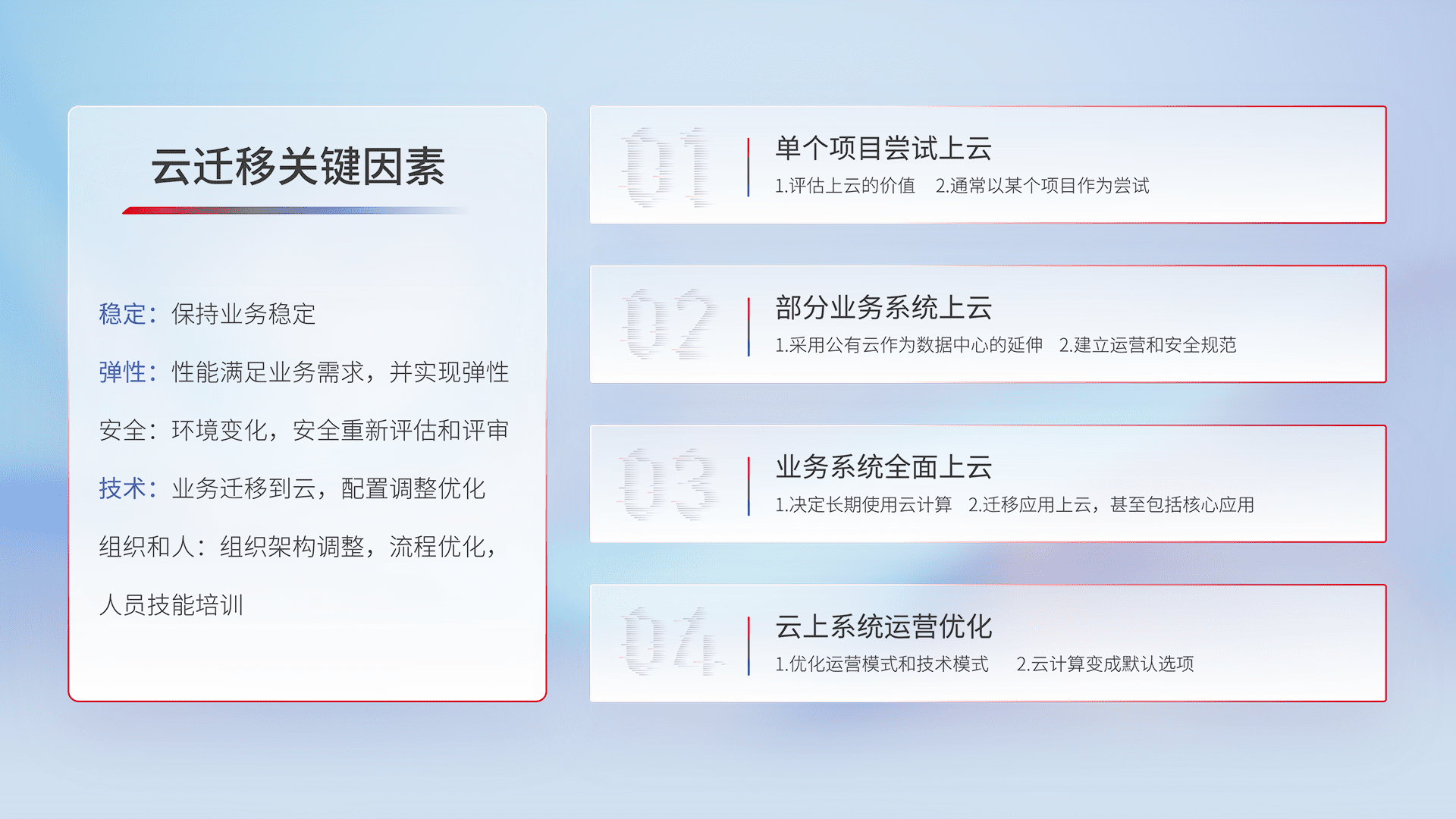 结合实际业务,,从规划设计、、云平台选型、、、云原生改造、、、、数据迁移、、、集成交付,,,,迁移全过程为客户识别最佳上云路径,,,,做好风险识别管理,,,,设计网络架构、、、身份权限、、安全审计合规、、、操作审计、、、日志审计、、监控告警策略、、、多站点容灾设计等,,,,对云上基础设施进行整体规划,,,提升IT治理水平,,,,以满足弹性、、、高可用、、高性能的需求。。。。