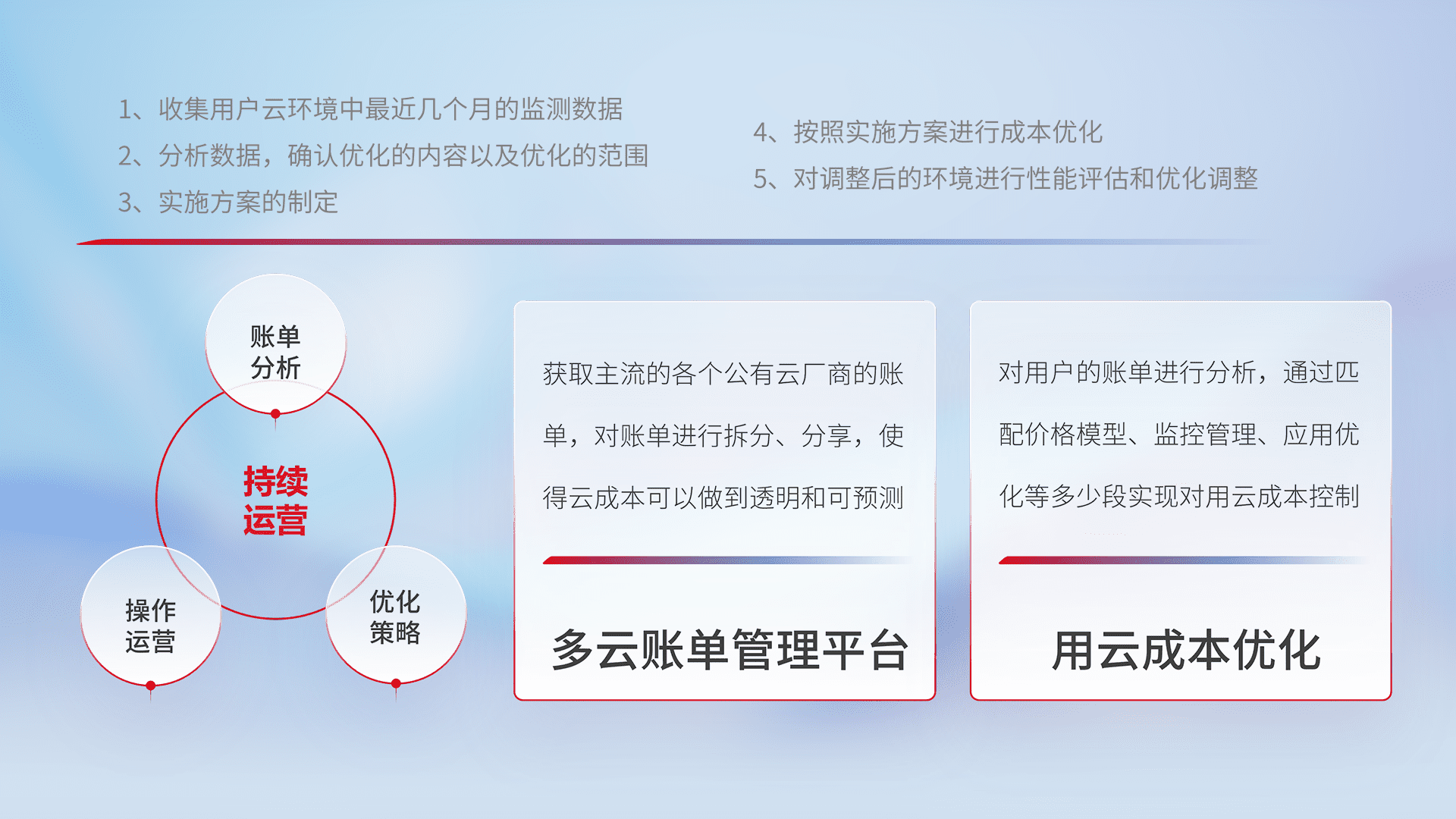 通过多云纳管,,,以统一的资源数据模型把客户的云资源进行抽象和封装,,,进而实现对多云资源的统一操作,,,保障云资源管理的可靠性、、、、稳定性与可用性。。量身定制化运维内容,,,,配置、、、、开发运维、、、、补丁管理、、、、备份、、、监控、、认证和访问管理、、审计和日常巡检等,,保障在用云过程中的可靠度,,,稳定度以及高可用率。。。。